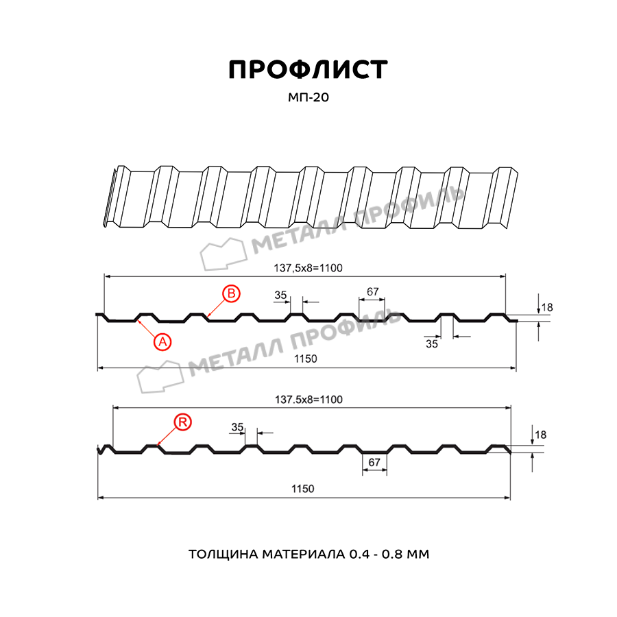 Профиль МП-20 относится к универсальным cтройматериалам. В сравнении с другими модификациями профлиста, этот изготавливается в трёх версиях: А, В и R. Типы А и В применяются для кровельных работ, облицовки стен, возведения ограждений, для внутренней обшивки складских зданий, гаражей, ангаров и т.п. Вариант с буквой R отличается наличием капиллярной канавки и используется для обустройства кровли. В зависимости от зоны применения, МП-20 изготавливается из оцинкованной стали толщиной от 0,4 до 0,8 мм. Важная деталь: хоть в названии указана цифра 20, на самом деле глубина этого профнастила – 18 мм. Это материал эконом-класса и имеет доступную стоимость. МП-20 – надёжный и долговечный стройматериал, преимущества которого высоко оценивают не только частные домовладельцы, но и промышленные строители. Он отличается хорошей несущей способностью, выдерживает значительные статические нагрузки и эффективно противостоит нагрузкам динамическим.
