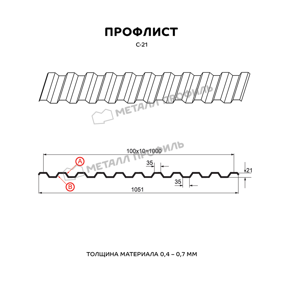 Профнастил с маркировкой С-21 следует понимать, как «стеновой» вариант с глубиной профиля 21 мм. Тем не менее, С-21 – один из наиболее многофункциональных стройматериалов, применяемый не только для фасадов. Он подойдёт как для обшивки стен, так и для монтажа кровли, установки ограждений. Вполне успешно С-21 находит применение при создании торговых павильонов, складских помещений, быстровозводимых сооружений, а также в качестве элемента сэндвич-панелей. С-21 отлично подходит в качестве стройматериала для Профилированного листа. Для этого он обладает хорошей несущей способностью. Расположенные на небольшом расстоянии друг от друга трапециевидные волны обеспечивают ему достаточную жёсткость. А пропорциональный рельеф гофры, идентичный с обеих сторон, придаёт Профилированному листу гармоничный облик. По вашему заказу мы можем выпустить профиль С-21 с различной толщиной металла от 0,4 до 0,7 мм. Для повышения срока службы и внешней привлекательности, профилированный лист изготавливается с финишным покрытием различных цветов и текстур, включая покрытия под кирпич, камень, дерево.